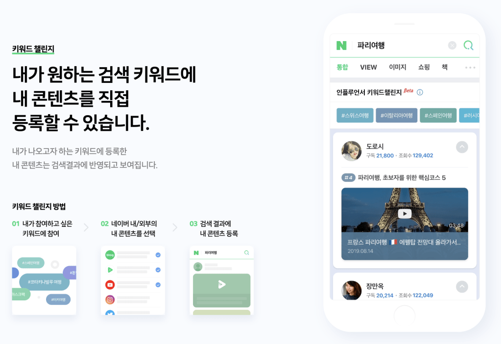 네이버가 새로운 검색 서비스를 발표했습니다. ‘인플루엔서 검색‘이라는 서비스에요. 네이버 검색 결과에 인플루언서가 유투브/인스타그램 등의 다른 플랫폼에 올린 컨텐츠를 노출해줍니다. 그냥 검색되는게 아니라, ‘파리여행’, ‘색조메이크업’ 같은 키워드에 인플루언서가 직접 컨텐츠를 큐레이션할 수 있게 해주었습니다. 더불어 인플루언서들의 채널을 모아보는 ‘인플루언서홈’까지 만들어서 노출 효과를 극대화해주는 검색입니다. 한동안 변화가 없던 네이버 검색 서비스에 오랜만에 발표된 소식인데, 그동안의 네이버 검색이 걸어온 길을 생각해보면 꽤나 큰 변화입니다.