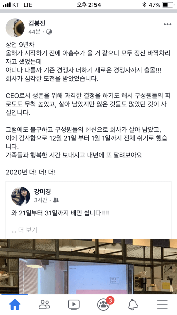 배달 전쟁 말고도 올 한해 커넥츠나 배달로봇 같은 프로젝트드도 여럿 내고, 내년에 상장한다는 소문으도 있어서 한번 숨고르는 느낌이네요. 고생한 멤버들이 함께 쉰다니 좋아 보입니다.