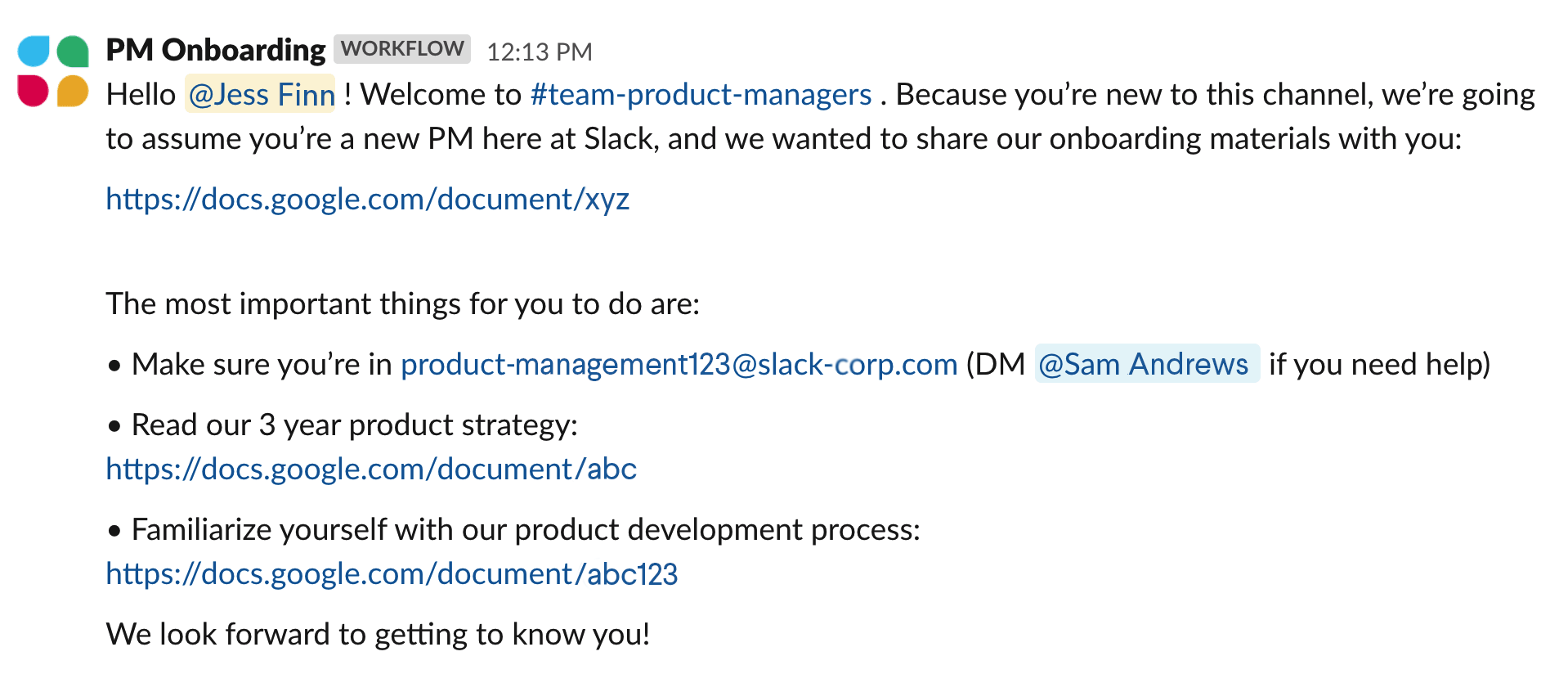 슬랙의 최신 기능인 워크플로우 빌더(Workflow builder)는 누구나 자동화된 작업을 만들어주는 툴입니다. 코딩을 못하(거나 잊어버린 사람 😉)도 자동화 로직을 만들 수 있어요. 예를 들어 팀의 신규 입사자를 환영하기 위해 #team-product-manager 채널에 간단한 온보딩 워크플로우를 추가하면, 신규 입사 PM에게 자동으로 환영 패키지와 함께 온보딩 체크 리스트 문서가 전달됩니다.