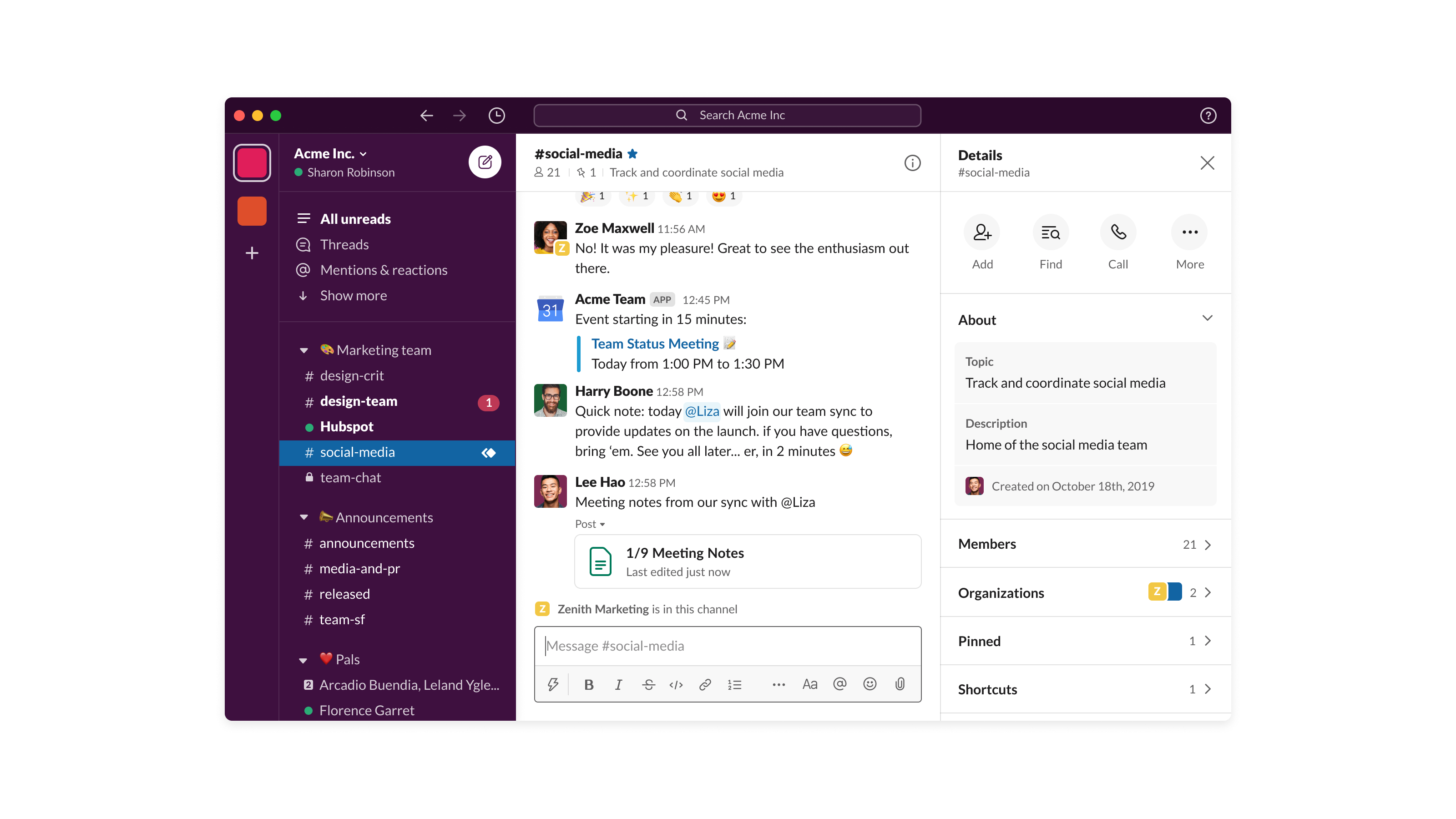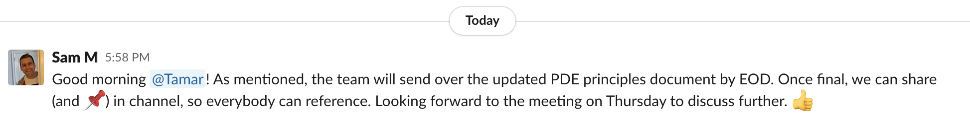 무엇보다, 우리는 가능한 모든 대화를 공개적으로 진행해 모든 사람들이 모든 정보에 접근할 수 있도록 합니다. 예를 들어, 소규모 그룹 및 임원과 매주 제품 리뷰를 진행해 불필요한 회의에 참가하지 않게 사람들의 시간을 절약합니다. 그리고 중요 내용은 공개 채널에 ‘핀’해서 모두가 볼 수 있도록 만듭니다. 파일, 메시지 등 여러 아이템을 핀해두면 어떤 채널에 가든 사람들이 원하는것을 쉽게 찾을 수 있어서 매우 편리합니다.