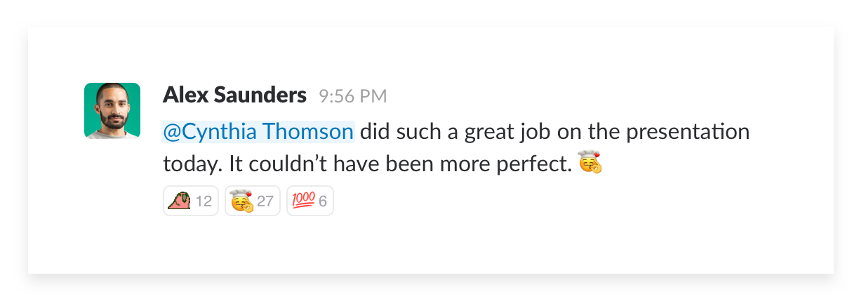 마지막으로 드리고 싶은 말씀은, 슬랙으로 커뮤니케이션하는 것이 텍스트뿐만은 아니라는 사실입니다. 이모지는 우리가 사용하는 작지만 중요한 소통 수단입니다. 팀원이 채널에서 좋은 소식을 알리고 싶을 때, 우리는 종종 🎉 이모지를 사용해서 축하하거나, 응원의 + 이모지를 남깁니다. 제가 어디에 있든지 동료에게 이모지로 반응을 남길 수 있습니다.