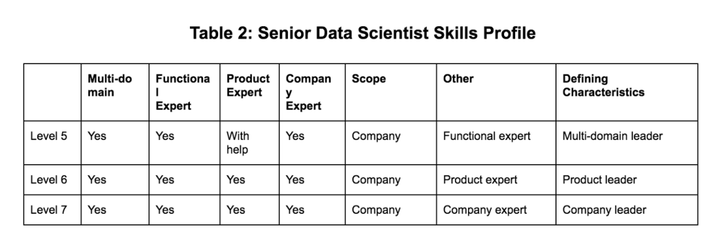 - 여기서 5단계에서부터 시니어 데이터 사이언티스트로 부를 수 있습니다. 예를 들면, 주니어는 결제 관련 리스크 전문가일 수 있지만 스팸 영역에서 인사이트를 얻을 경우에는 도움이 되지 않을 수 있습니다. 하지만 5단계에서부터는 리스크와 관련된 회사 내 여러 분야에서 전문 지식을 활용할 수 있습니다. 그에 따라 시니어는 수준 높은 기술적 리더십을 통해 더 큰 규모에서 효율성을 제공할 수 있는 전문가이자 리더로 자리 잡게 됩니다.