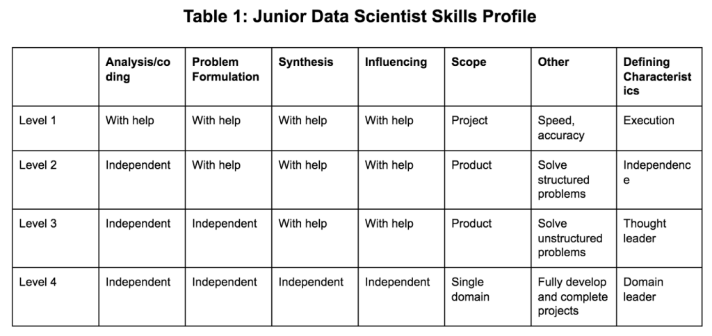 어떤 레벨이든 퀄리티 높은 작업으로 이루어져야 합니다. 업무 퀄리티는 모든 데이터 사이언티스트들에게 동일하게 요구되나 주니어들은 시니어와 같은 임팩트를 내기 위해 어느 정도 도움이 필요할 수 있습니다.