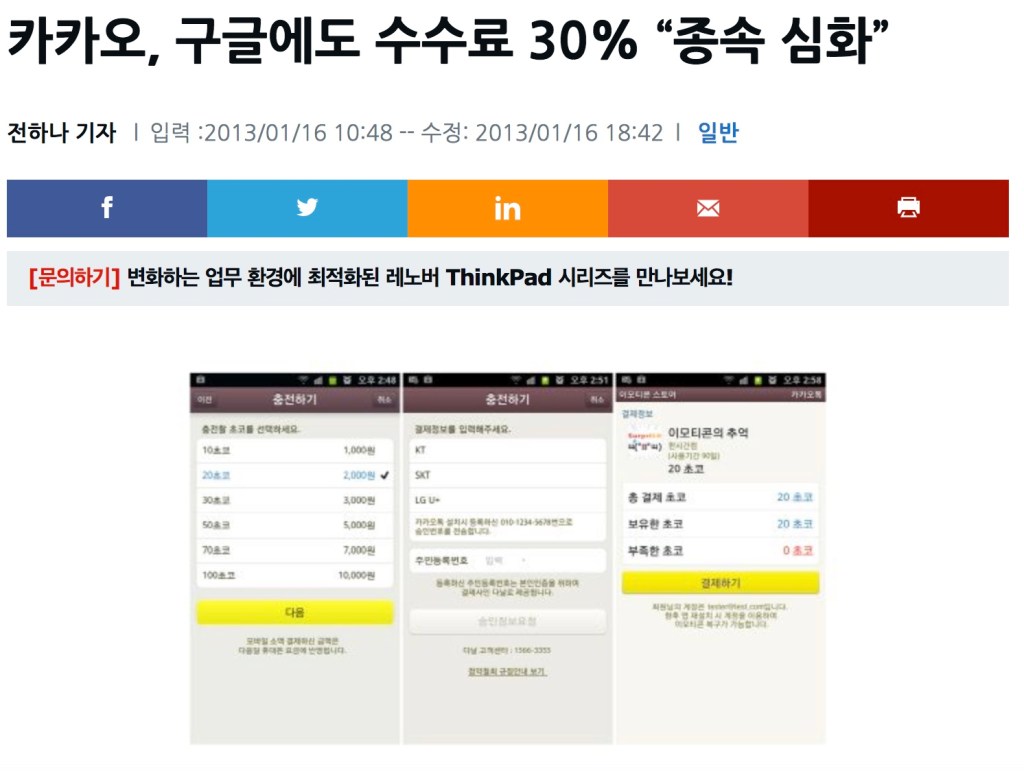 아아니? 이거이거 카카오도 구글에 종속된다고? 라고 생각될 수 있지만 잠깐 날짜를 다시 한 번 보면… 2013년 1월의 지디넷의 기사입니다. 저때가 얼마나 옛날이냐면, <애니팡>이 여전히 1등먹던 시절이고, <모두의 마블>이 출시되기도 전이에요. 그때부터 이 이야기는 있었어요. 30%라는 숫자도 그대로였고, 구글 플레이에 올리는 앱에 외부 빌링을 연동시켜서는 안되었어요. 구글은 그때부터 주야장천 ‘30% 지켜라, 외부 빌링 쓰지마라’라는 말을 해왔던거죠.