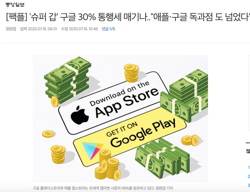 지난 7월의 중앙일보 기사입니다. 어후 아주 헤드라인만 봐도 아주 악의가 철철 흘러넘칩니다. 소위 야마가 엄청 세요. 다짜고짜 구글을 ‘슈퍼 갑’이라고 하네요. ‘통행세’라고 언급도 합니다. ‘독과점’이 ‘도 넘었다’라고 이야기하네요. 와 기사 본문을 읽기도 전부터 와 이놈들 진짜 나아쁜 놈이구나 하는 생각이 듭니다. 다른 기사들 역시 톤이 죄다 비슷해요. 구글이 하는 것 없이 삥을 뜯는 것처럼, 그리고 ‘최근에서야 그 본색을 드러낸 것처럼’ 이야기하죠.