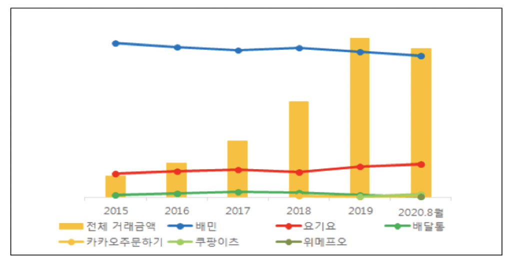 공정위에 따르면 배민과 요기요의 시장점유율은 97%나 된다고 합니다. 배민이 79% 요기요가 18% 정도 되는듯해요.