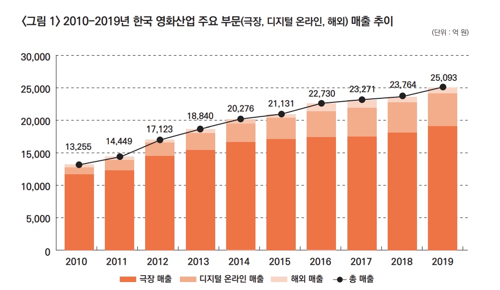 영화산업에는 다양한 매출이 있습니다. IPTV나 OTT로 유통되는 디지털(2차) 수익, 국내 영화가 해외에 판매되며 거두는 해외 매출도 있죠. 최근 OTT가 엄청 성장하고 있고요. 하지만 이 모두를 합친 것보다 극장 매출이 세 배 큽니다. 국내 영화산업이 CGV를 가진 CJ, 롯데시네마를 가진 롯데, 메가박스를 가진 중앙(예전엔 쇼박스계열이었죠) 중심으로 돌아가는게 이 이유입니다.