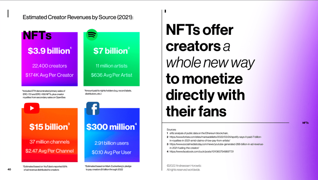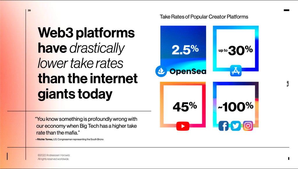 페이스북과 인스타그램은 크리에이터가 생산한 결과물을 독점하지만, NFT 마켓플레이스인 오픈씨OpenSea의 수수료는 2.5%에 불과합니다. (리포트 39p) 미국 국회의원 리치 토레스는 최근 기고에서 “빅테크들이 마피아보다 많은 수수료를 가져간다는 것은 뭔가 잘못되어 있다는 것이다”는 평을 했죠.