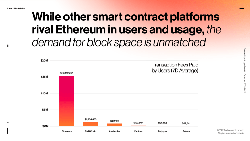 개발자들의 기여도로만 따진다면, 매월 4천명의 개발자들이 활동하는 이더리움 네트워크는 단연코 가장 큰 영향력을 자랑합니다. (리포트 18p) 그 뒤로는 솔라나 (1천명), 비트코인 (500명)과 같은 프로젝트들이 따라오고 있죠. 이더리움의 압도적인 존재감은 왜 사용자들이 매일 평균 200억원 가량의 수수료를 기꺼이 지불하는지를 설명합니다. (리포트 16p)