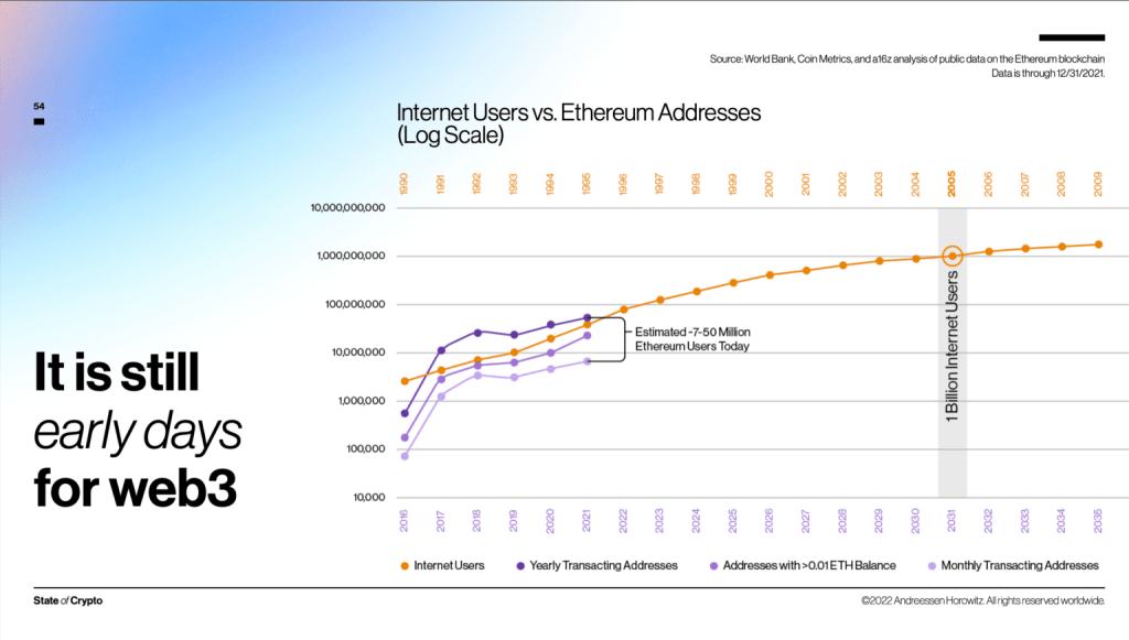 웹3.0 생태계의 정확한 사용자 수를 파악하기는 어렵지만, 과거의 발전 양상을 통해 현재 우리가 어디 쯤 와있는지 짐작할 수 있습니다. 이더리움 네트워크 상의 활동 정도를 보건대, 현재 700만에서 5천만명의 유저가 있다고 추산됩니다. (리포트 54p)