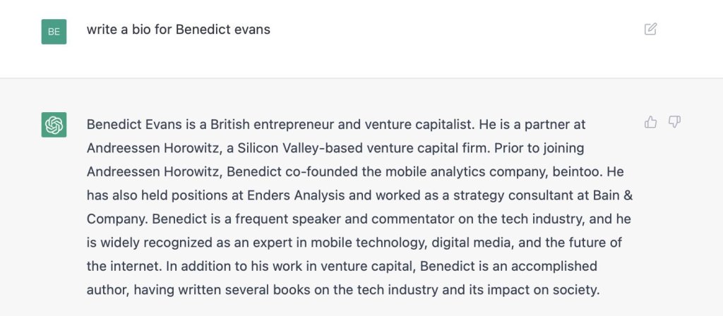챗GPT에게 ‘베네딕트 에반스(주: 원문의 저자)’의 약력을 작성해달라’고 요청하면 ‘안드레센 호로비츠에서 일하고(퇴사했지만), 베인앤컴퍼니에서 일했으며(아닙니다만), 회사를 창업했고(아니에요), 책을 여러권 썼다(아니거든요)고 표기되네요.