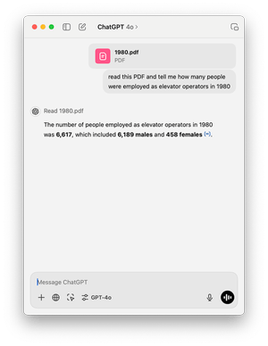 여기 내가 실제로 자주 하는 일 중 자동화가 되면 좋겠다 싶은 구체적 예시가 있다. 챗GPT 4.0에게 “미국에서 1980년에 엘리베이터 안내원(elevator operators)은 몇 명이 고용되었는가?”를 물어봤다. 미국 인구조사국(US Census)이 이 데이터를 수집해서 발표했는데, 그 답은 1980년 기준 21,982명이다(PDF 17페이지에 나와 있음).