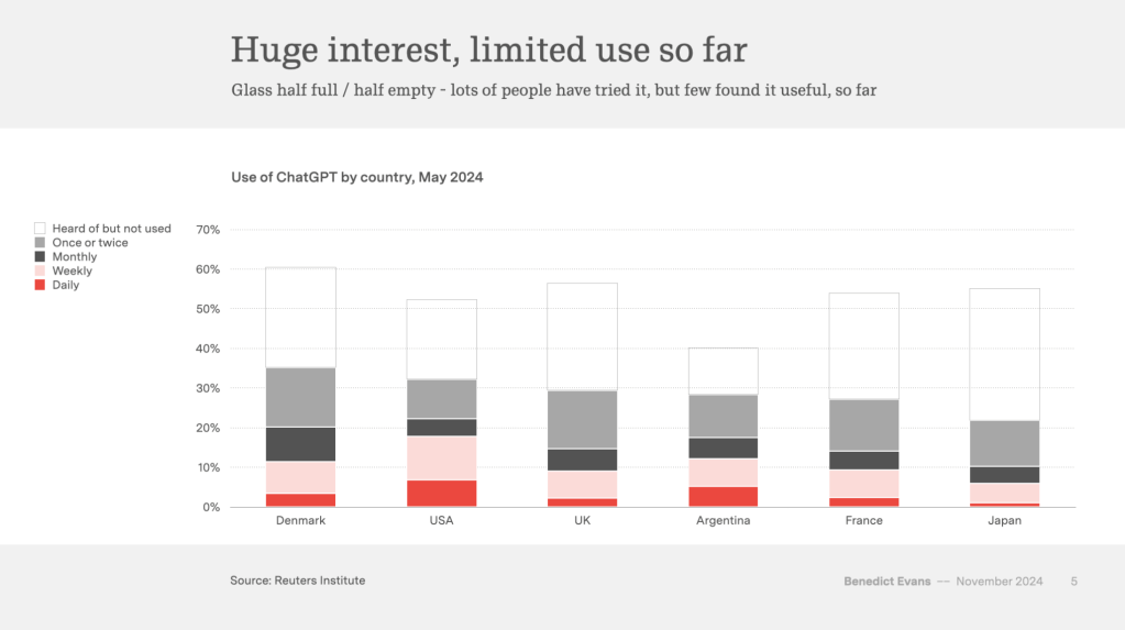그러나 놀라운 확산 속도에도 불구하고, 대부분의 사용자는 단 한 번 사용해보고 “와, 정말 똑똑하네”라고 감탄한 뒤 더 이상 찾지 않았습니다. 매일 이 기술을 활용하는 사람은 소수에 불과합니다. 기업들도 마찬가지입니다. 대부분의 대기업에서는 CIO가 ChatGPT 계정 비용을 지불하는 정도의 시범 사업만 진행 중이며, 실제로 무언가를 배포 단계까지 진행한 기업은 훨씬 적습니다.