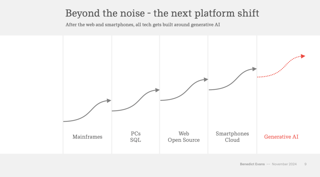이런 상황은 사실 기술 산업이 10-15년마다 겪어온 플랫폼 시프트의 초기 단계와 매우 비슷합니다. 1960년대 중반부터 1970년대 후반의 메인프레임, 1980년대의 PC, 1990년대 후반의 웹, 2000년대 후반의 스마트폰, 그리고 이제 생성형 AI로 이어지는 패턴입니다. 기술 업계는 생성형 AI가 다음 큰 플랫폼 시프트라는 데 대체로 동의하지만, 그 이상의 질문에는 아직 명확한 답이 없습니다.