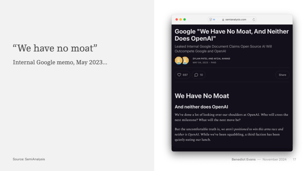 이런 대규모 투자가 이루어지는 핵심 이유는 “자본”이 경쟁력의 핵심 요소(해자)가 되었기 때문입니다. 페이스북이 LLM을 오픈소스로 풀었을 때 구글 내부에서 “우리는 해자가 없고, OpenAI도 마찬가지”라는 메모가 돌아 화제가 되었죠. Anthropic의 CEO는 “현재 훈련 중인 모델은 10억 달러에 가까운 비용이 들며, 2025-2026년에는 50-100억 달러가 들 것”이라고 말했습니다.