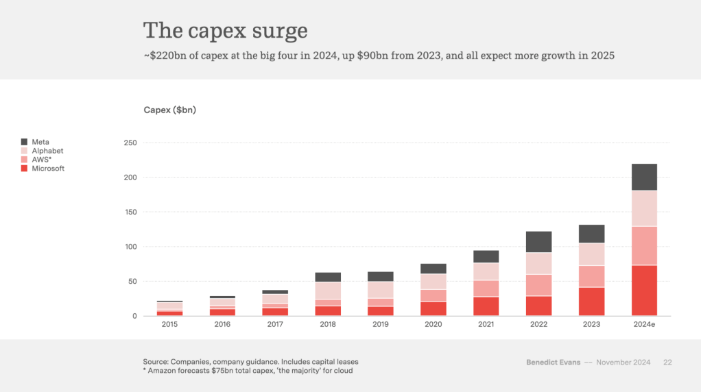 규모의 경제를 보여주는 사례로, Llama 3.1은 16,000개의 엔비디아 GPU(약 5억 달러 상당의 칩)를 사용했고, 현재 사용되는 클러스터는 100,000개의 GPU를 사용합니다. 메타, 알파벳, AWS, 마이크로소프트의 설비투자는 2023년 900억 달러에서 2024년 2,200억 달러로 급증했으며, 2025년에는 더 늘어날 전망입니다. 특히 주목할 점은 마이크로소프트가 매출의 25% 이상을 설비투자에 쓰고 있다는 것입니다. 이는 인프라 기업으로 여겨지는 통신사들(매출의 15% 투자)보다도 높은 수준입니다. 한때 “1달러짜리 CD를 100달러에 팔던” 소프트웨어 기업이 이제는 제품을 판매하기 위해 막대한 물리적 인프라를 구축해야 하는 기업으로 변모한 것입니다.