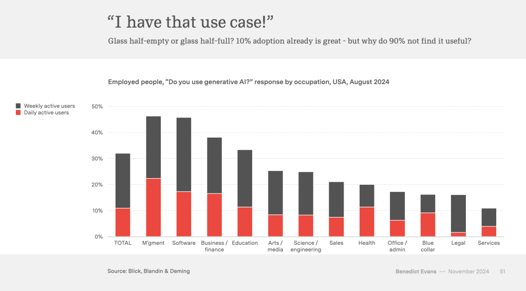 지금까지 LLM은 소프트웨어 개발(GitHub의 Copilot 등이 20-30%의 효율성 향상을 보고하고 있습니다), 마케팅 콘텐츠 생성 (유사한 수준으로 효율성이 높아졌습니다), 고객지원(오류 관리가 중요하지만, 활발하게 도입되는 중입니다) 측면에서 뛰어난 유즈케이스를 만들어내고 있습니다. 그리고 미국 내 고용된 사람들 중 일부 분야에서는 약 20%가 이미 생성형 AI를 업무에 활용하고 있습니다. 반면 법률과 같이 정확성이 중요한 분야에서는 도입이 상대적으로 더딥니다.
