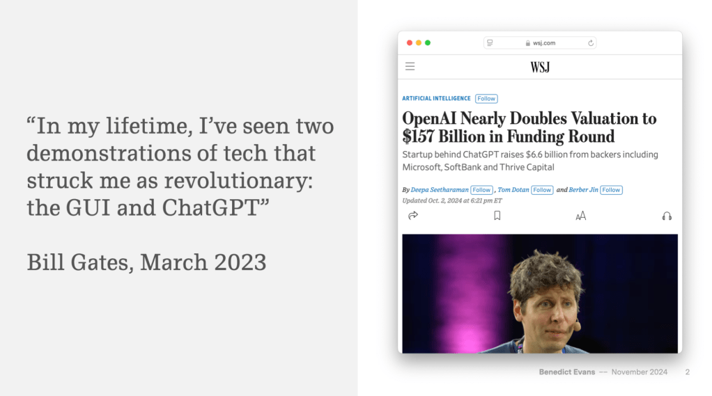 마이크로소프트가 1,500억 달러 가치에 도달하는 데 약 25년이 걸렸지만, OpenAI는 제품 출시 후 단 12-18개월 만에 1,600억 달러의 가치평가를 받았습니다. 전 세계 인구의 1/3에서 2/3가 이미 ChatGPT를 알고 있거나 사용해 보았을 정도로 빠르게 확산되었습니다.