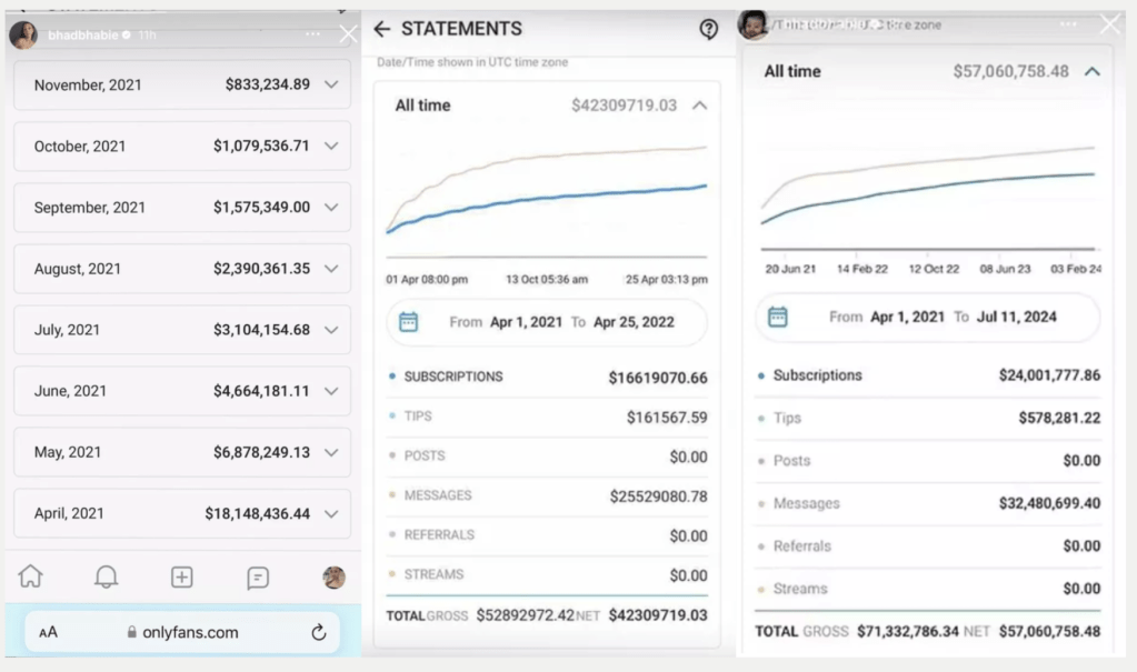 이는 2021년 배드 바비 온니팬스에 가입한 첫 해의 기록, 2022년 4월과 2024년 7월의 누적 수치 등을 보여주는데, 독자 검증을 거치진 않았으나 총매출이 7천만 달러를 넘고, 배드 바비가 실제로 받은 금액은 5천7백만 달러에 달함을 시사합니다.매출의 절반 이상은 특정 유저에게 개별적으로 메시지를 판매(pay-per-view)한 거래에서 발생했다고 합니다(여기에는 맞춤형 오디오/비디오 콘텐츠를 포함할 수도 있음).