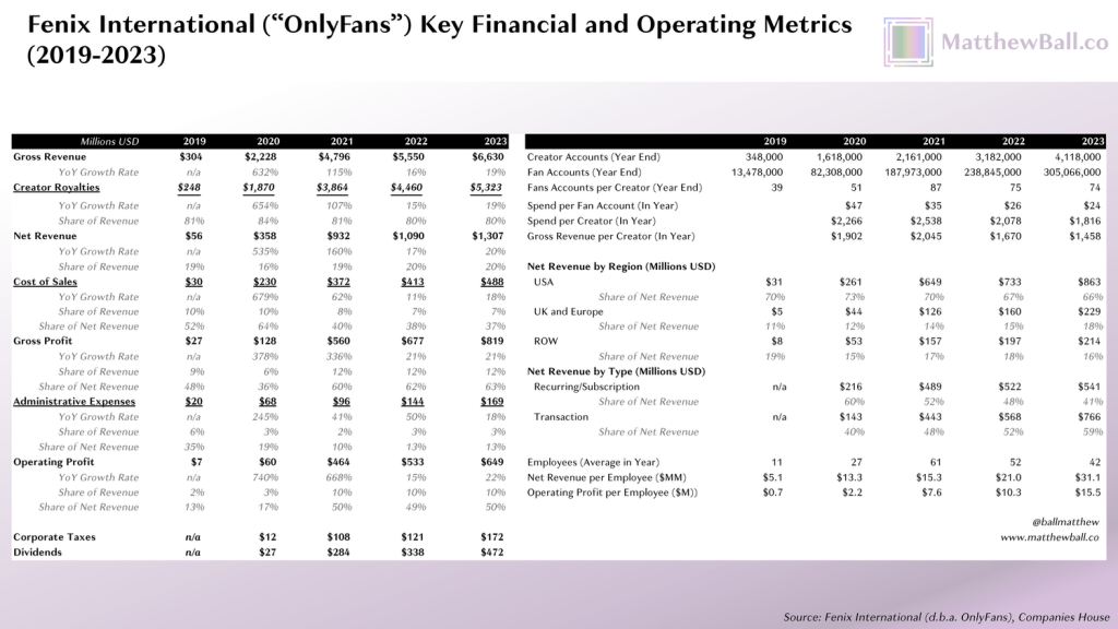 온니팬스가 총매출의 80%를 크리에이터에게 돌려주는데도, 회사는 상당한 수익을 남기고 있습니다. 2023년 기준 순매출은 13억 달러, 매출 총이익은 8.2억 달러였습니다(4.9억 달러의 ‘매출원가’ 중 절반 이상이 신용카드 결제 수수료, 나머지는 대역폭이나 서버 비용일 것으로 추정).