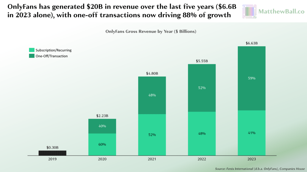 지난 5년간 온니팬스 크리에이터들이 가져간 누적 수익은 150억 달러(약 20조 원)가 넘고, 2023년에는 연 53억 달러를 벌었습니다(전년 대비 19% 증가).