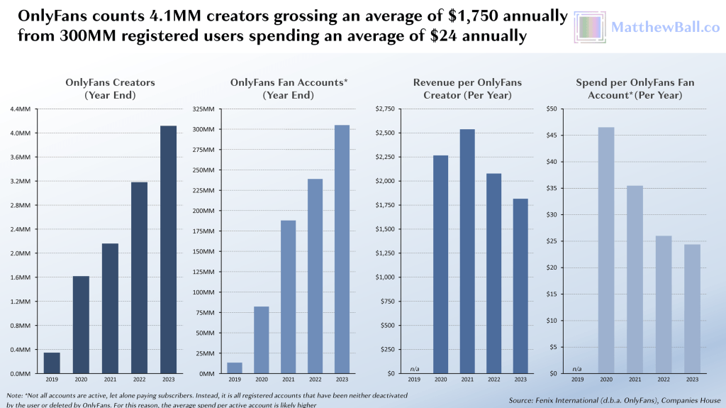 현재 온니팬스 매출은 폰허브(PornHub), 브래저스(Brazzers), 레드튜브(RedTube), 유폰(YouPorn), 엑스튜브(XTube)를 보유한 포르노 대기업 아이로(Aylo, 이전 이름 MindGeek)의 2배 정도로 추정되고, 등록된 유저는 3억 명을 넘는다고 합니다(물론 이들 전부가 유료 가입자이거나 활발히 활동 중인지는 불분명합니다). 매출의 3분의 2는 미국에서 발생하며, 영국과 유럽을 합치면 16%, 나머지 17%가 그 외 지역(Rest of World)이 차지합니다.