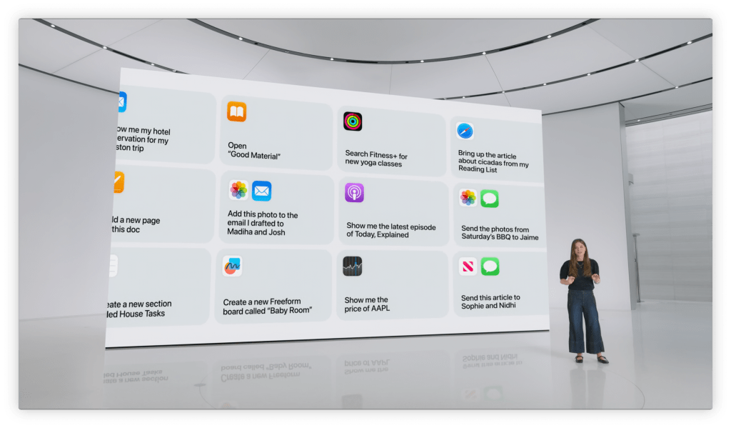 WWDC에서 보여준 핵심 시연은 “엄마 비행기가 언제 도착하지? / 점심 약속은 어떻게 되어 있지? / 공항에서 우리 목적지까지 얼마나 걸릴까?” 같은 식으로, 이전에는 컴퓨터가 대답하기 어려웠던 일상 속 복잡한 질문을 자연스럽게 던지고 답하는 시나리오였습니다. 아이폰은 사용자의 ‘엄마’가 누구인지 알고, 최근 몇 주간 오간 이메일이나 메시지 등의 대화 내역에서 임박한 항공편을 찾아내고, 필요한 데이터를 보여주는 식입니다.