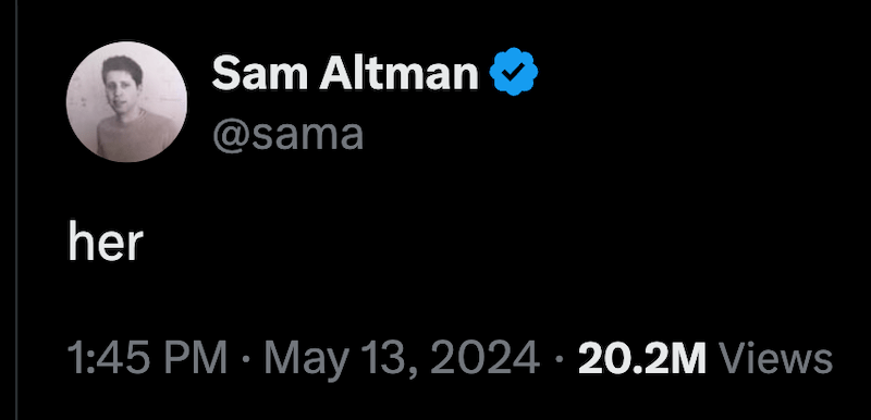 그런데 최근 1~2년 간, 테크·비즈니스 업계에서는 이 영화를 ‘희망적인’ 사례로 꼽는 경우가 늘었습니다. 오픈AI의 CEO 샘 올트먼은 자사에서 ‘스카이(Sky)’라는 여성형 말투와 다소 귀여운 화법을 가진 AI 대화 시스템을 선보인 날, 트위터에 “her”라고만 쓰며 영화 <그녀>를 암시하기도 했습니다.
