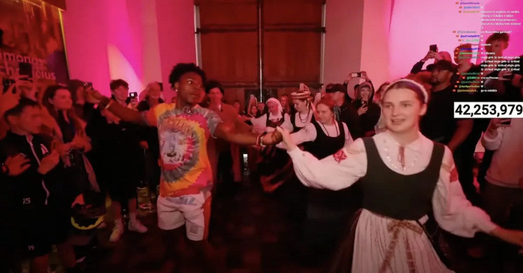 구호를 외치는 팬들의 군중도 대기 중이었다. 틱톡·인스타그램·유튜브 팔로워가 총 1억 2,000만 명에 달하는 신시내티 출신의 이 스트리머는 보안 요원들과 함께 미니버스에 올라타 옛 궁전으로 향했다. 빌뉴스 시장은 그에게 치즈와 꿀을 대접했고, 젊은 리투아니아 여성 무용단은 전통 춤을 선보였다.