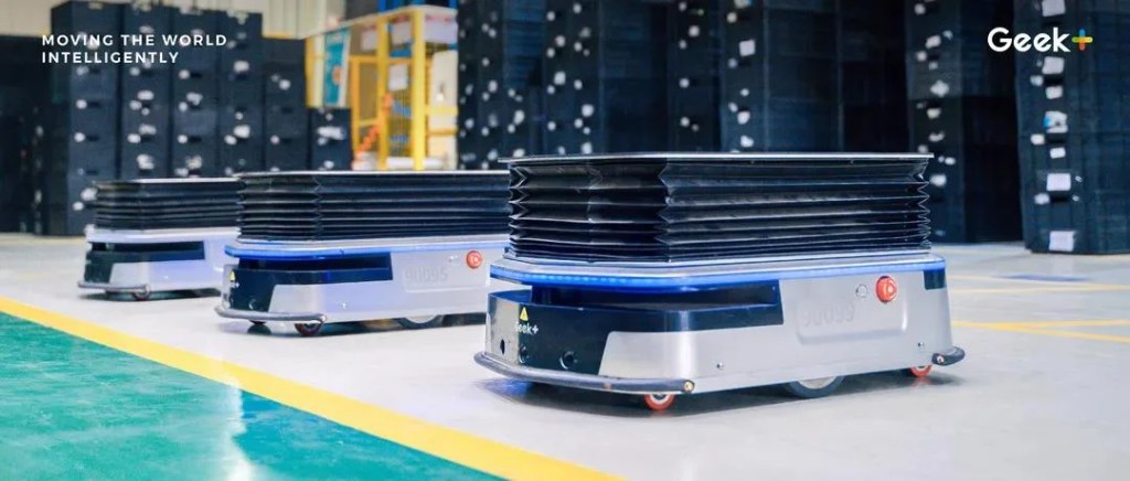중국 물류 자동화 기업 긱플러스(Geek+)는 중국 전역 제조·물류 시설에 2만 대 이상의 AGV를 배치했다. 최신 모델은 1,500kg까지 운반하며, 라이다(LIDAR)·AI 경로 탐색으로 복잡한 환경도 주행한다.