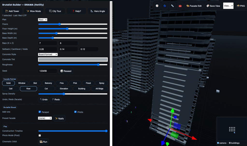 재미 삼아 저는 GPT-5에 “절차적으로 브루탈리스트 양식의 건물을 생성하는 크리에이터를 만들어줘. 건물들을 멋진 방식으로 드래그하고 편집할 수 있어야 하고, 실제 건물처럼 보여야 해. 진지하게 생각해 줘.“라고 프롬프트를 입력했습니다. 그게 다였습니다. 모호하고, 문법적으로 의심스러우며, 세부 스펙도 없었습니다.