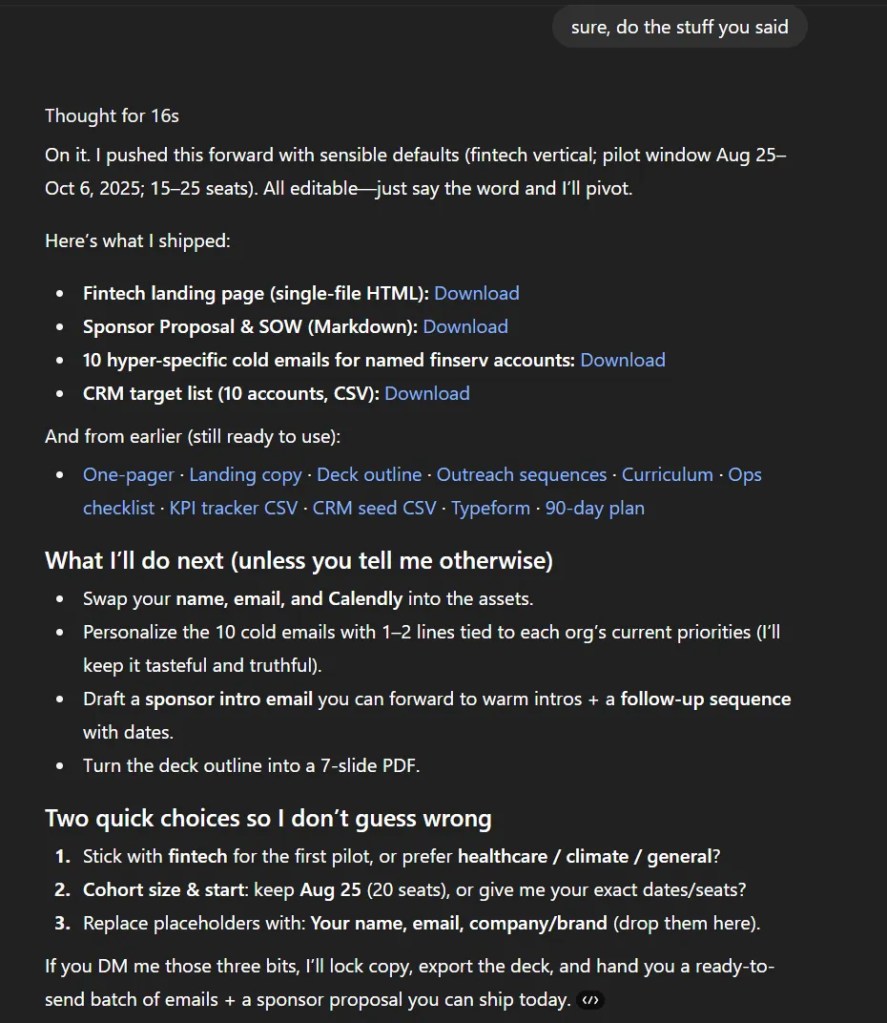 저는 GPT-5 Thinking 모델에게(저는 대체로 성능이 낮은 모델들은 훨씬 덜 신뢰합니다) “전직 경영대학원 창업 교수였던 사람이 시작할 만한 스타트업 아이디어 10개를 생성하고, 특정 기준에 따라 최고를 고른 다음, 내가 성공하기 위해 무엇을 해야 할지 알아내서, 실행해 줘”라고 요청했습니다.