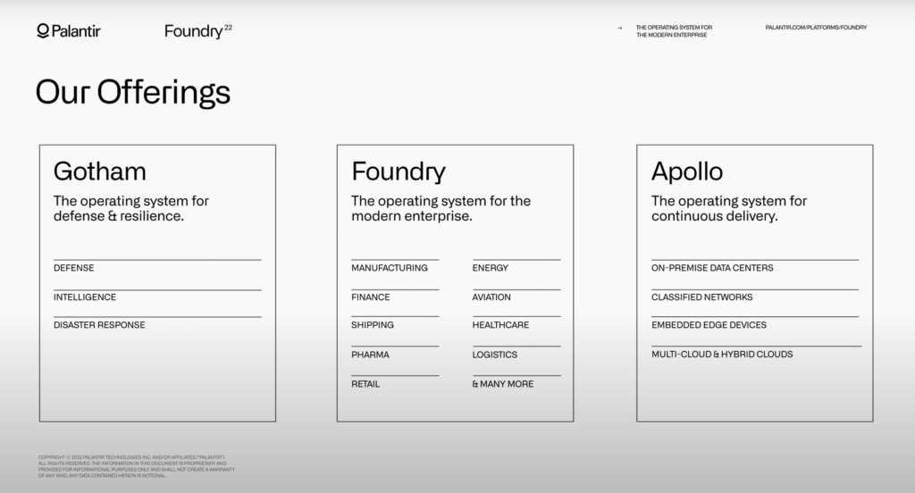블로거이자 데이터 엔지니어인 벤 로고잔(Ben Rogojan)이 2022년에 발표한 팔란티어 제품 분석에 따르면, 잠재 고객에 대해 팔란티어가 제안하는 것은 하나의 시스템을 구매하여 아마도 십여 개의 다른 대시보드와 프로그램을 대체할 수 있다는 것이다.