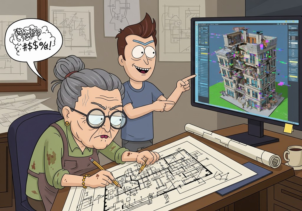 3D 모델링 시대에는 모델을 한 번 수정하면 모든 평면도와 입면도가 자동으로 변경됩니다. 실수의 비용이 극적으로 낮아진 덕분에 효율성은 높아졌지만, 반복적인 수작업을 통해 건물을 속속들이 이해하던 깊이 있는 학습 과정이 증발해버렸습니다.