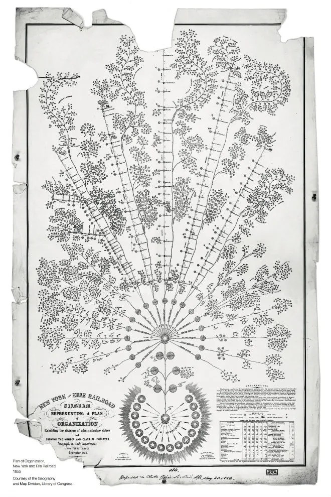 1850년대 중반, 뉴욕-이리 철도의 대니얼 맥컬럼은 수천 명의 노동자와 함께 500마일 이상 뻗어 있는 시스템을 관리하기 위해 세계 최초의 조직도(Organizational chart)를 고안했습니다. 소규모 철도에 통용되던 주먹구구식 관리 방식은 한계를 드러냈고, 기차 충돌로 사람들이 목숨을 잃고 있었기 때문입니다.
